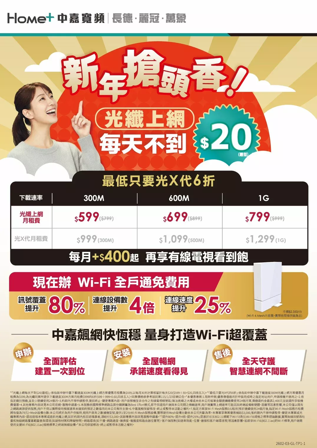 告別 WiFi 訊號不穩、跨樓層就變慢的困擾!現在申辦中嘉寬頻指定光纖上網方案,立即獨享 Wi-Fi 全戶通免費建置!