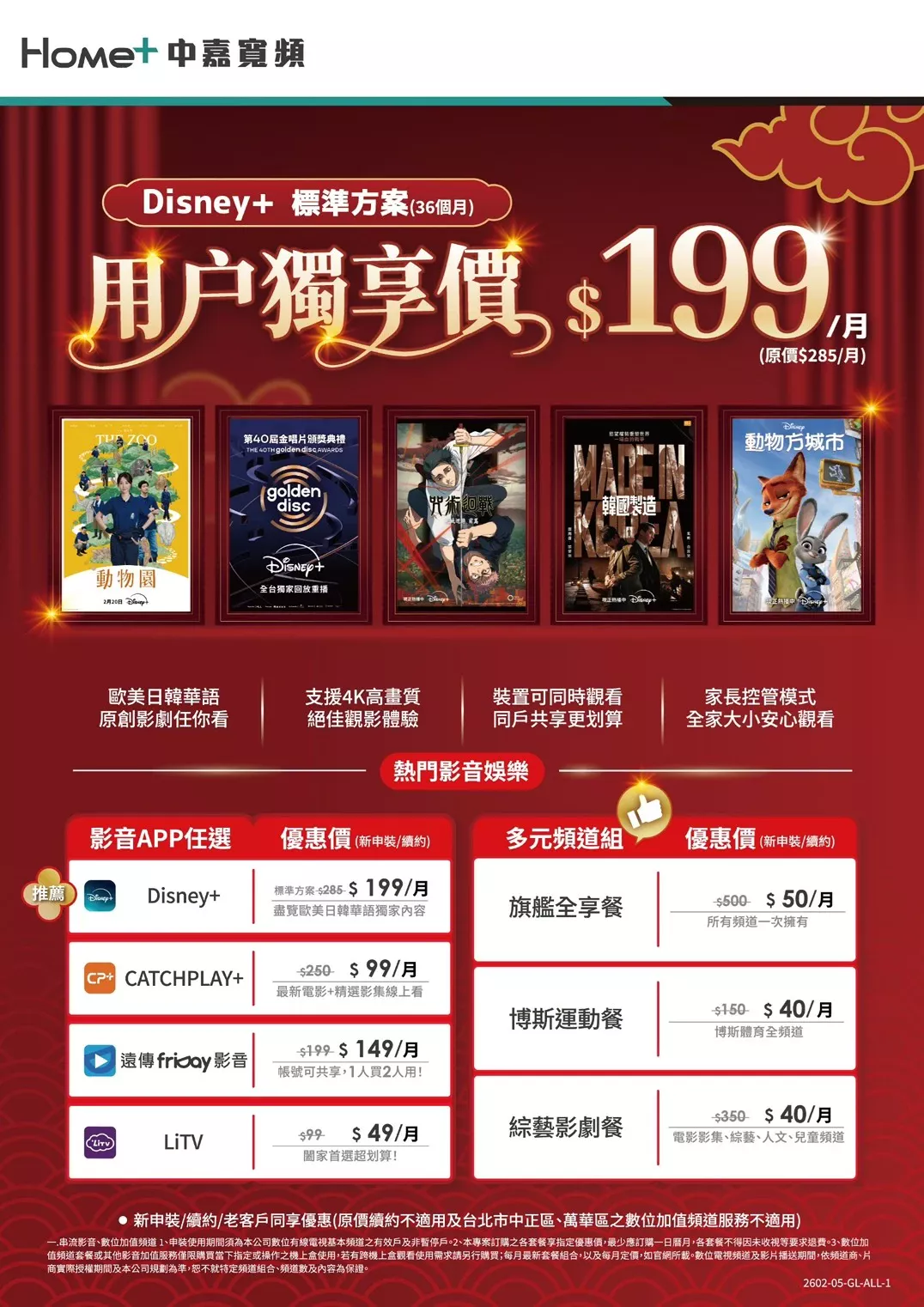 中嘉寬頻|長德 用戶專屬好康!Disney+ 標準方案 36 個月獨享優惠價,每月只要 $199(原價$285/月),輕鬆暢看歐美日韓華語原創影劇。除了 Disney+ 之外,還有多款熱門影音 APP 與多元頻道組合可供選擇,無論新申裝、續約或老客戶,通通同享優惠價格。