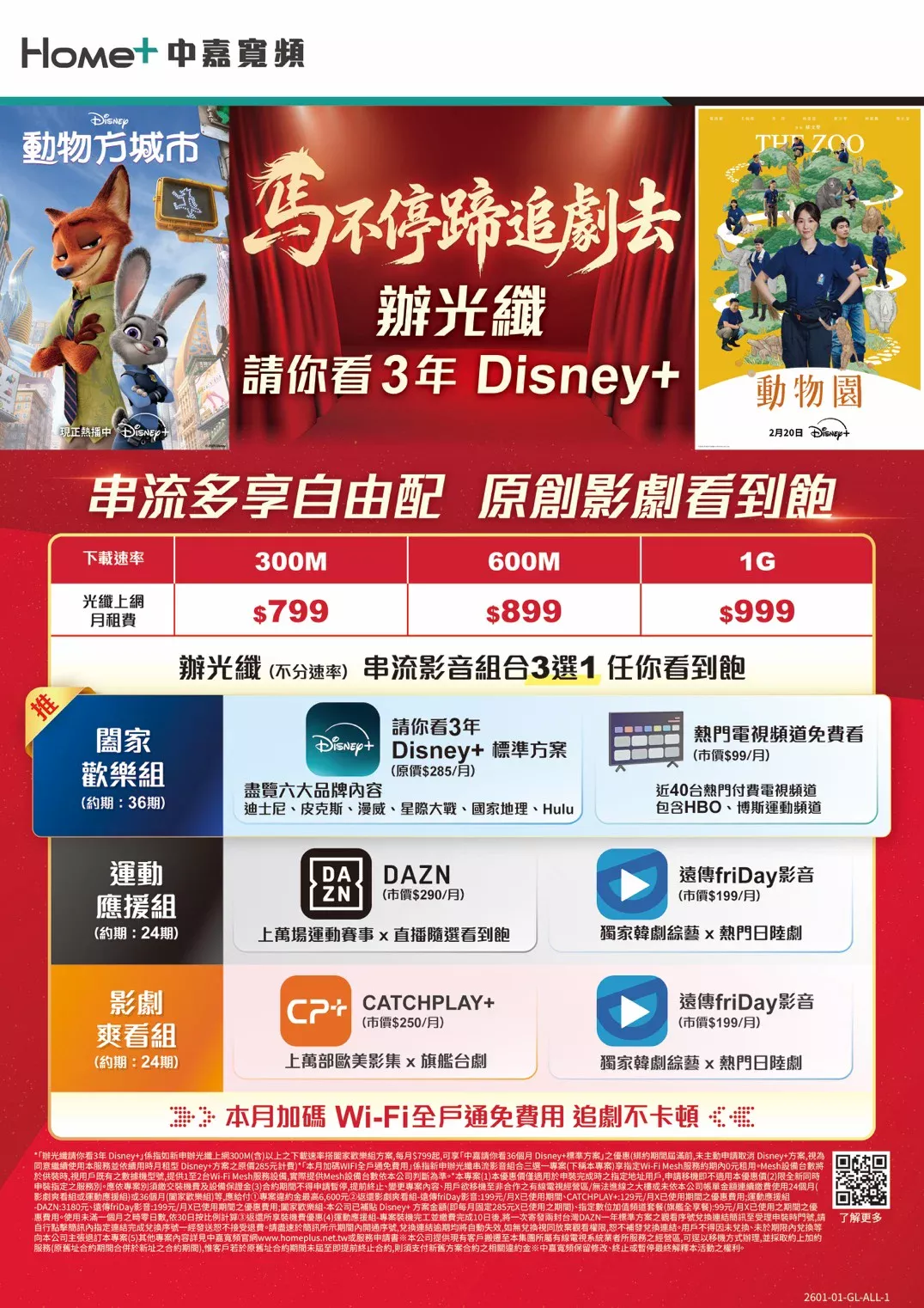 中嘉寬頻|長德 馬不停蹄追劇去!申辦光纖上網,即享3年 Disney+ 標準方案(原價$285/月)免費看到飽,還能從三大串流影音組合中自由挑選,不論是追迪士尼經典、看運動賽事直播還是追歐美影集,通通滿足你的影音需求。